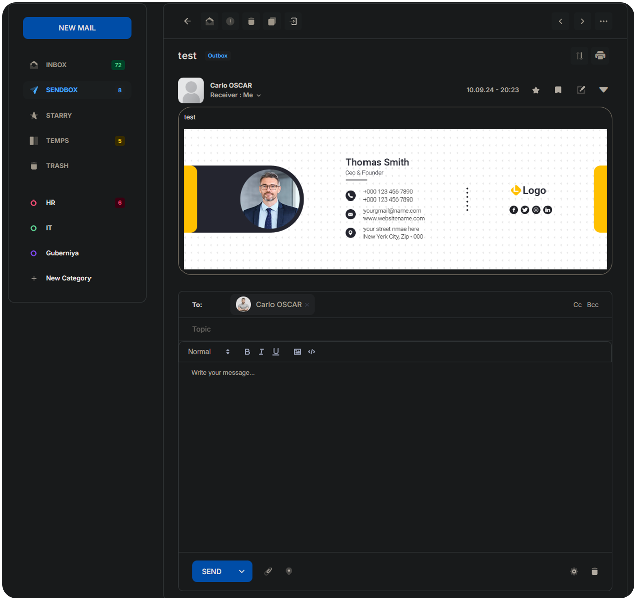 Her E-posta, Markanızın Yansımasıdır. MailBox modülü, şirketinizin profesyonel ve kurumsal kimliğini her e-postada en etkili şekilde temsil etmenizi sağlar. Personellerinizin unvanlarını ve iletişim bilgilerini içeren kişiye özel imzalar, manuel müdahale gerektirmeksizin otomatik olarak oluşturulur. Güvenli ve spam korumalı şekilde alıcıya iletilir. Şirketiniz tüm saldırılardan korunur.