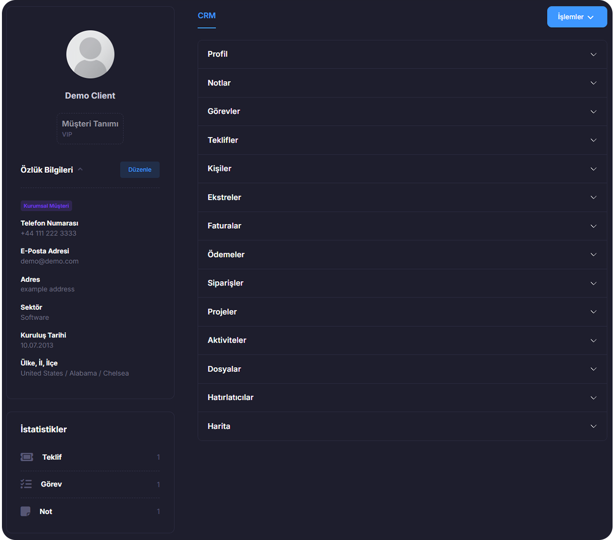 Müşteri bilgilerini düzenli tutmak, projeleri yönetmek ve finansal süreçleri kontrol etmek çoğu zaman karmaşık hale gelebilir. Müşteriler modülü, tüm bu süreçleri tek ekranda birleştirir, işlerinizde düzen ve netlik sağlar. İletişimden ödeme takibine kadar her adımı kolaylaştırır, size sadece işinize odaklanma imkanı sunar.